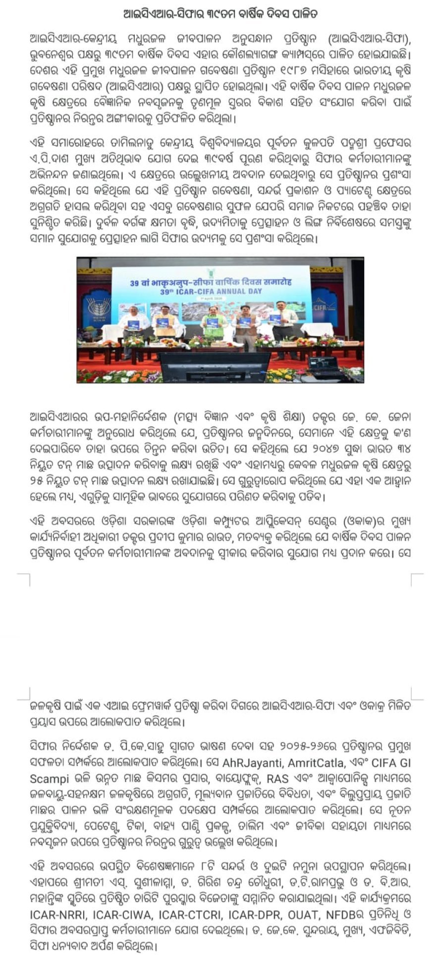 ଆଇସିଏଆର-ସିଫାର ୩୯ତମ ବାର୍ଷିକ ଦିବସ ପାଳିତ