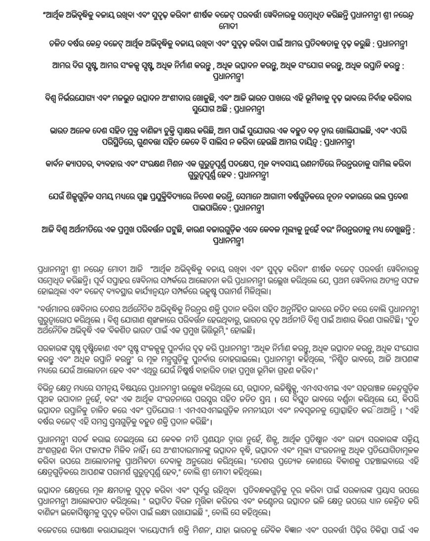 “ଆର୍ଥକ ଅଭିବୃଦ୍ଧିକୁ ବଜାୟ ରଖୁବା ଏବଂ ସୁଦୃଢ଼ କରିବା" ଶୀର୍ଷକ ବଜେଟ୍ ପରବର୍ତ୍ତୀ ୱେବିନାରକୁ ସମ୍ବୋଧୂତ କରିଛନ୍ତି ପ୍ରଧାନମନ୍ତ୍ରୀ ଶ୍ରୀ ନରେନ୍ଦ୍ର ମୋଦୀ
