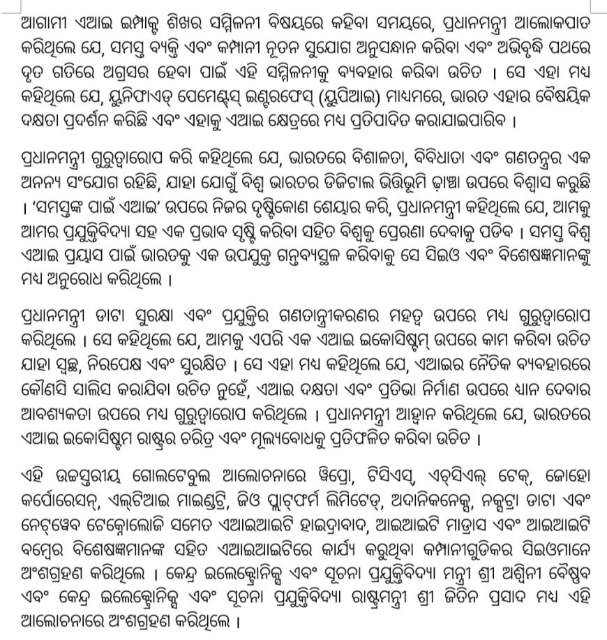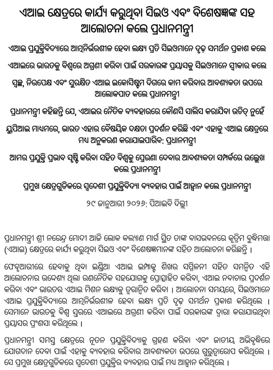 ଏଆଇ କ୍ଷେତ୍ରରେ କାର୍ଯ୍ୟ କରୁଥିବା ସିଇଓ ଏବଂ ବିଶେଷଜ୍ଞଙ୍କ ସହ ଆଲୋଚନା କଲେ ପ୍ରଧାନମନ୍ତ୍ରୀ