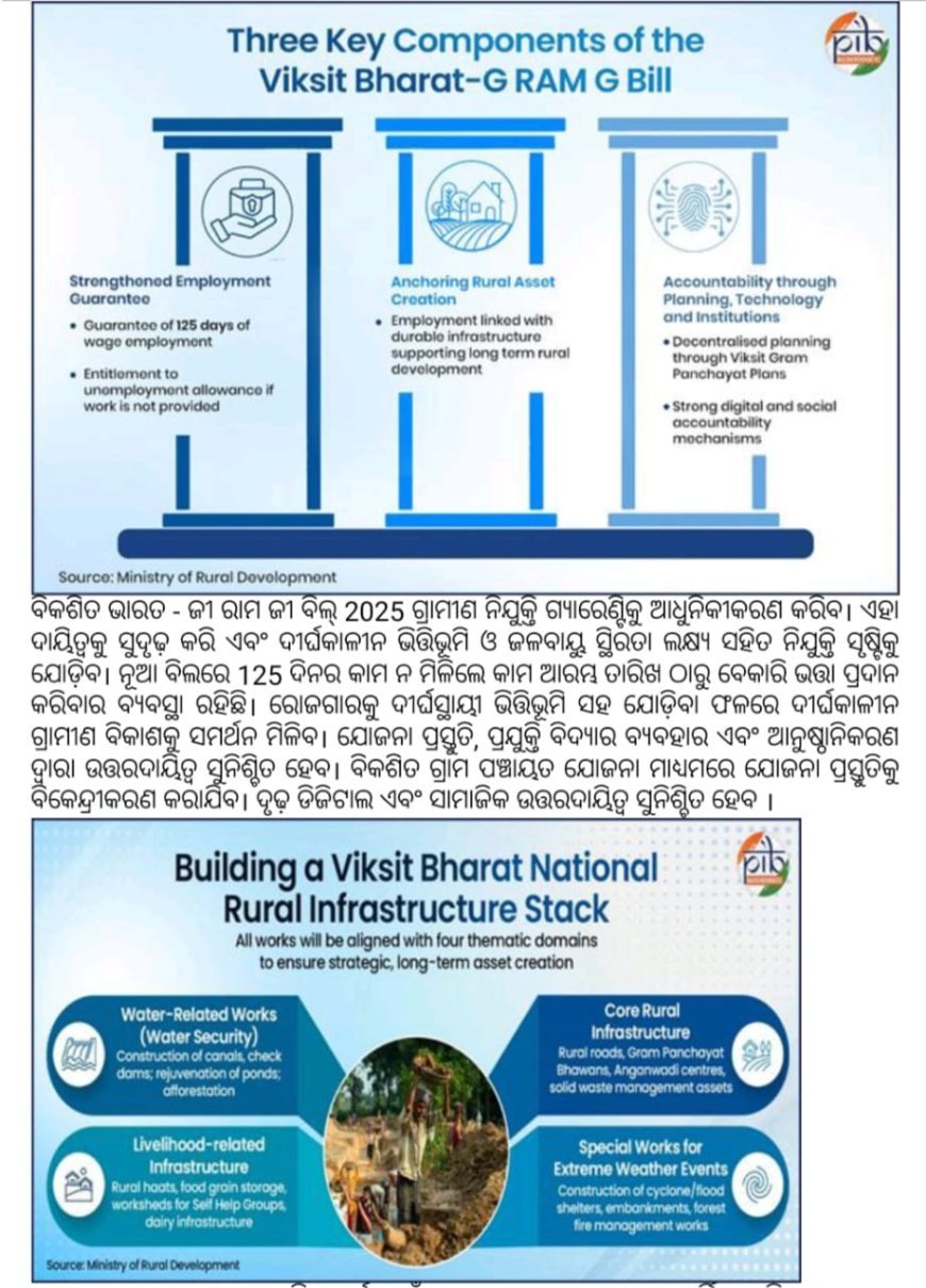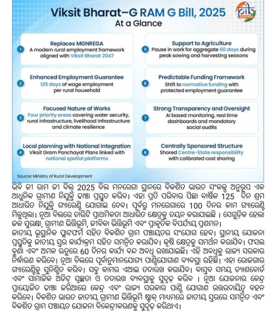 ବିକଶିତ ଭାରତ - ଜୀ ରାମ ଜୀ ବିଲ୍, 2025 ବିକଶିତ ଭାରତ 2047 ସହିତ ସଂଯୁକୁ ଏକ ନୂତନ ବୈଧାନିକ ଢାଞ୍ଚା ମାଧ୍ୟମରେ ମନରେଗାରେ ପରିବର୍ତ୍ତନ ଆଣିବ।