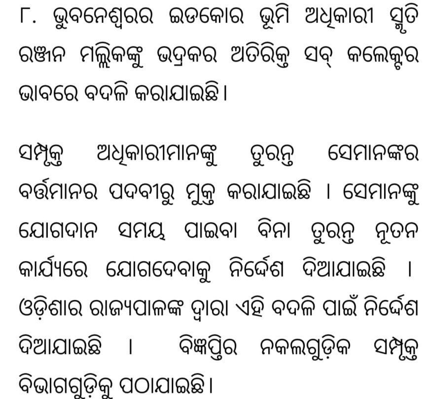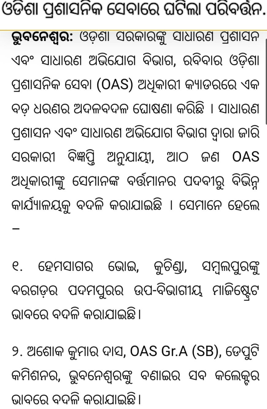 ଓଡିଶା ପ୍ରଶାସନିକ ସେବାରେ ଘଟିଲା ପରିବର୍ତ୍ତନ.