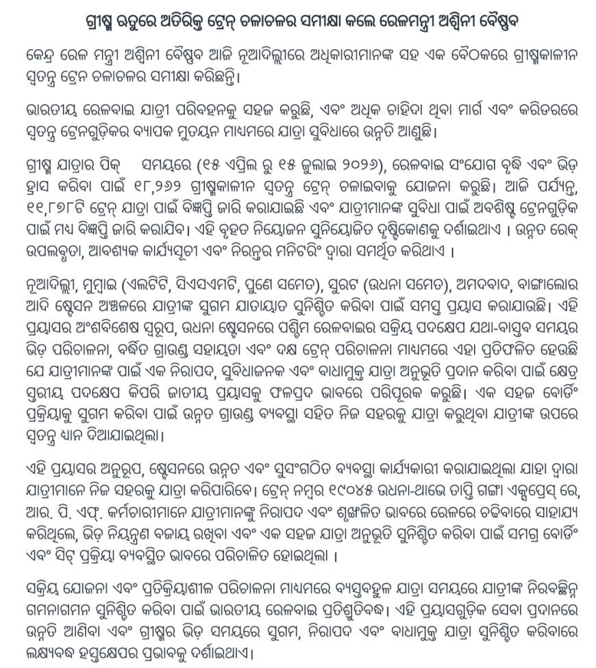 ଗ୍ରୀଷ୍ମ ଋତୁରେ ଅତିରିକୁ ଟ୍ରେନ୍ ଚଳ ଚଳାଚଳର ସମୀକ୍ଷା କଲେ ରେଳମନ୍ତ୍ରୀ ଅଶ୍ବିନୀ ବୈଷ୍ଣବ
