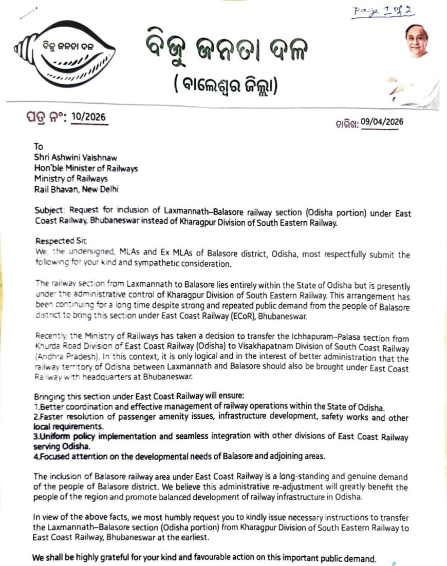 ଦକ୍ଷିଣ ପୂର୍ବ ରେଳବାଇର ଖଡ଼ଗପୁର ଡିଭିଜନ ପରିବର୍ତ୍ତେ ଲକ୍ଷ୍ମଣନାଥ-ବାଲସୋର ରେଳ ସେକ୍ସନ (ଓଡ଼ିଶା ଅଂଶ)କୁ ପୂର୍ବ ତଟ ରେଳବାଇ, ଭୁବନେଶ୍ୱର ଅଧୀନରେ ଅନ୍ତର୍ଭୁକ୍ତ କରିବା ପାଇଁ ଅନୁରୋଧ।