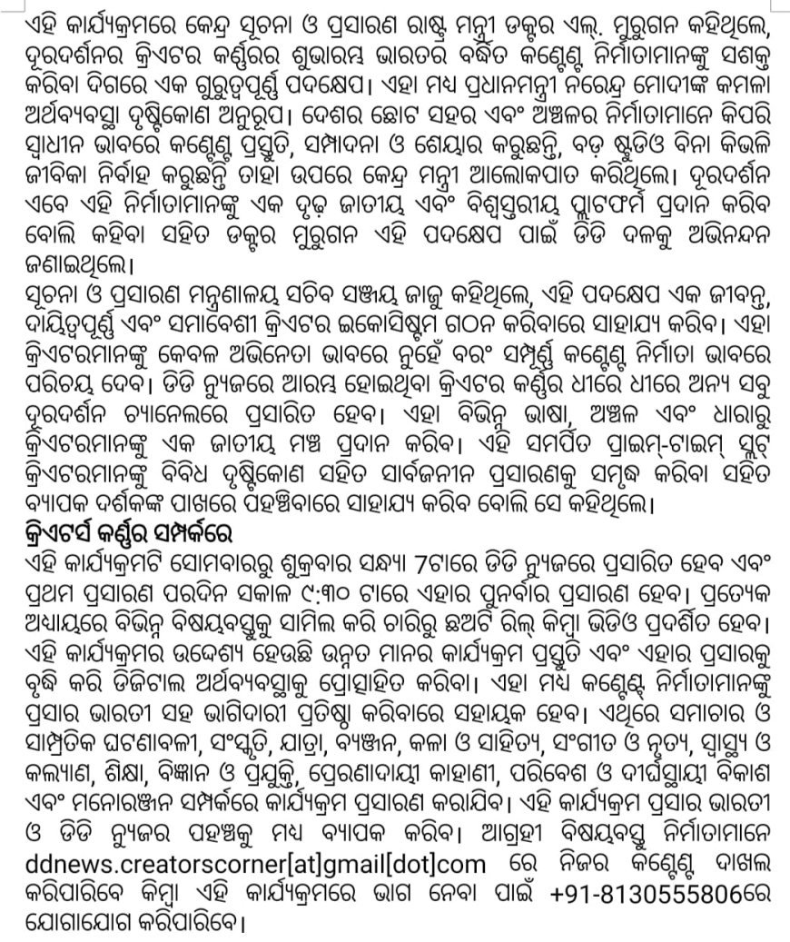 ଦେଶବ୍ୟାପୀ ଡିଜିଟାଲ୍ କ୍ରିଏଟରମାନଙ୍କୁ ସଶକୁ କରିବା ଲାଗି ଡିଡି ନ୍ୟୁଜରେ ‘କ୍ରିଏଟର୍ସ କର୍ଣ୍ଣର୍'ର ଶୁଭାରମ୍ଭ କଲା ପ୍ରସାର ଭାରତୀ