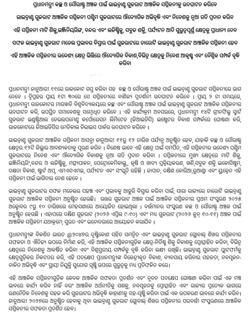 ପ୍ରଧାନମନ୍ତ୍ରୀ କଳ୍ପ ଓ ସୌରାଷ୍ଟ୍ର ଅଂଚଳ ପାଇଁ ଭାଇବ୍ରାଣ୍ଡ ଗୁଜୁରାଟ ଆଞ୍ଚଳିକ ସମ୍ମିଳନୀକୁ ଉଦଘାଟନ କରିବେ...