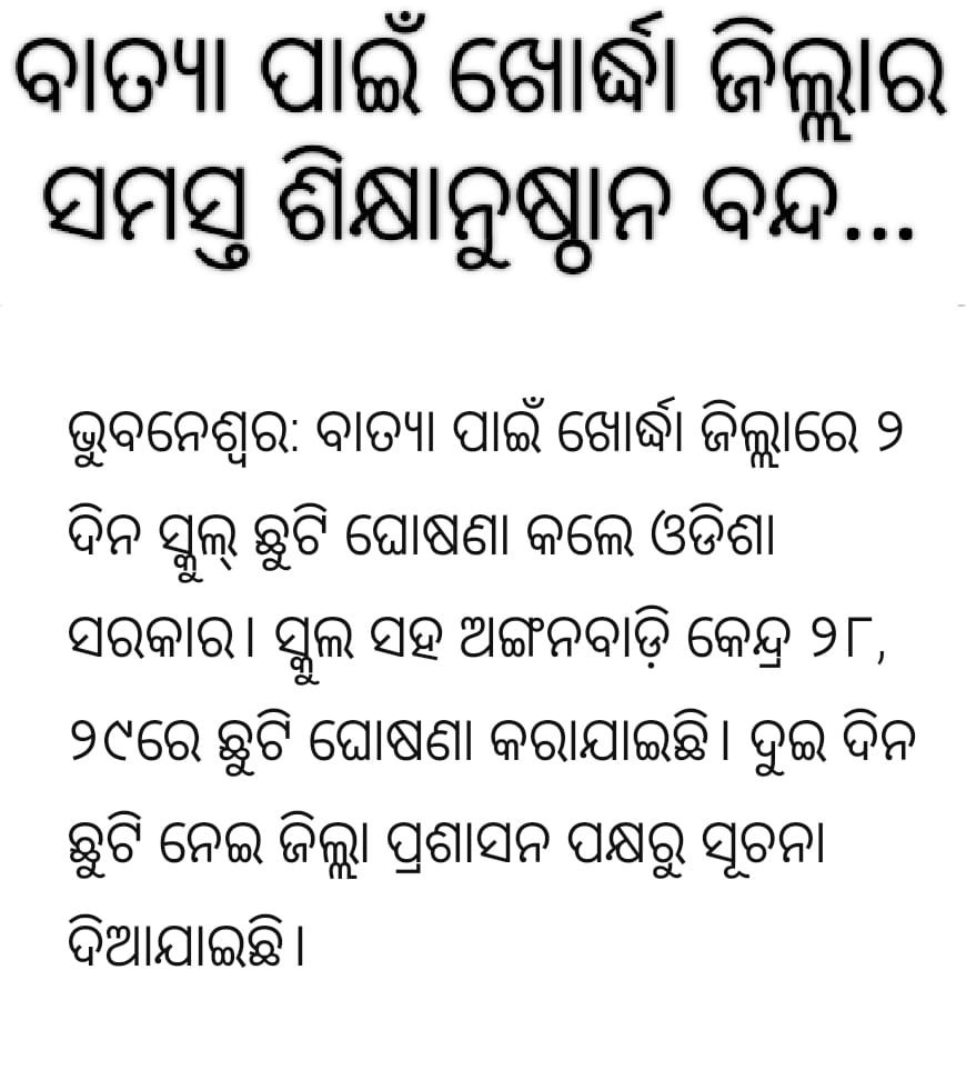 ବାତ୍ୟା ପାଇଁ ଖୋର୍ଦ୍ଧା ଜିଲ୍ଲାର ସମସ୍ତ ଶିକ୍ଷାନୁଷ୍ଠାନ ବନ୍ଦ