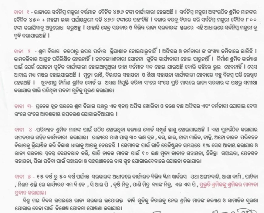 ବିଜେଡି ର ବିଜୁ ଶ୍ରମିକ ସାମ୍ମୁଖ୍ୟ ତରଫରୁ ରାଜ୍ୟ ସରକାରଙ୍କ ପାଖରେ ଶ୍ରମିକ ଦିବସ ଉପଲକ୍ଷେ ଦାବୀ...