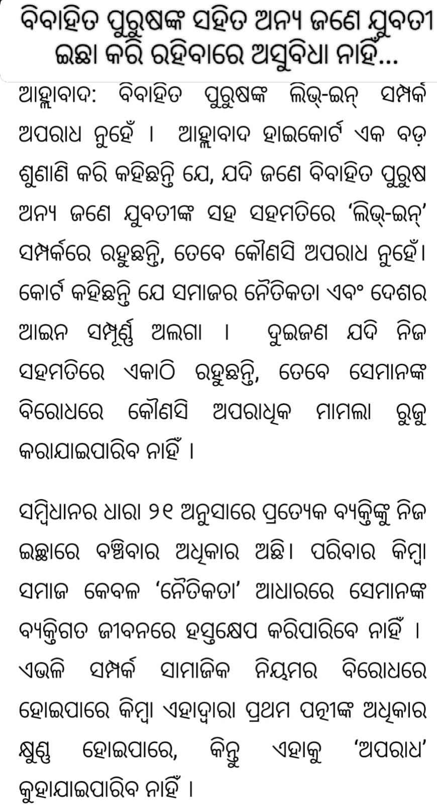 ବିବାହିତ ପୁରୁଷଙ୍କ ସହିତ ଅନ୍ୟ ଜଣେ ଯୁବତୀ ଇଛା କରି ରହିବାରେ ଅସୁବିଧା ନାହିଁ...