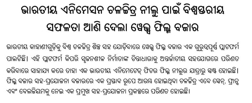 ଭାରତୀୟ ଏନିମେସନ ସଫଳତା ଆଣି ଚଳଚ୍ଚିତ୍ର ନୀଲୁ ପାଇଁ ବିଶ୍ବସ୍ତରୀୟ ଥାଣି ଦେଲା ୱେଲ୍ସ ଫିଲ୍ମ ବଜାର
