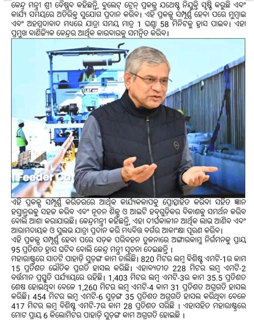 ସଫଳତାପୂର୍ବକ ସମ୍ପୂର୍ଣ୍ଣ ହୋଇଛି। ଏହା ରାଜ୍ୟରେ ବୁଲେଟ୍ ଟ୍ରେନ୍ ପ୍ରକଳ୍ପର ଦ୍ବିତୀୟ ସୁଡ଼ଙ୍ଗ। ଆଜି ନୂଆଦିଲ୍ଲୀରେ କେନ୍ଦ୍ର ରେଳ, ସୂଚନା ଓ ପ୍ରସାରଣ ଏବଂ ଇଲେକ୍ଟ୍ରୋନିକ୍ସ ଓ ସୂଚନା ପ୍ରଯୁକ୍ତି ମନ୍ତ୍ରୀ ଅଶ୍ବିନୀ ବୈଷ୍ଣବ ଏ ସମ୍ପର୍କରେ ଘୋଷଣା କରିଛନ୍ତି । ନବନିର୍ମିତ ପାହାଡ଼ି ସୁଡ଼ଙ୍ଗର ଲମ୍ବ ପ୍ରାୟ ଦେଢ଼ କିଲୋମିଟର। ଏହା ପାଲଘର ଜିଲ୍ଲାରେ ଆସୁଥିବା ପ୍ରକଳ୍ପର ସବୁଠୁ ଲମ୍ବା ସୁଡ଼ଙ୍ଗ।