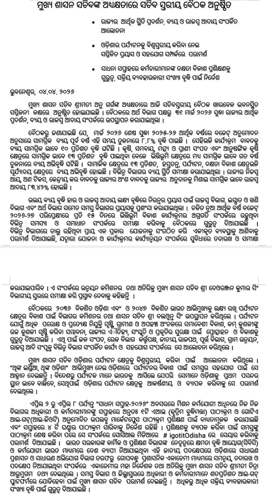 ମୁଖ୍ୟ ଶାସନ ସଚିବଙ୍କ ଅଧ୍ୟକ୍ଷତାରେ ସଚିବ ସୁରୀୟ ବୈଠକ ଅନୁଷ୍ଠିତ