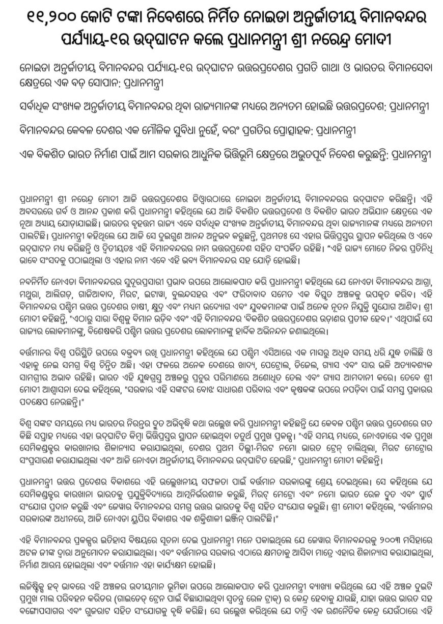 ୧୧,୨୦୦ କୋଟି ଟଙ୍କା ନିବେଶରେ ନିର୍ମିତ ନୋଇଡା ଅନୁର୍ଜାତୀୟ ବିମାନବନ୍ଦର ପର୍ଯ୍ୟାୟ-୧ର ଉଦ୍ଘାଟନ କଲେ ପ୍ରଧାନମନ୍ତ୍ରୀ ଶ୍ରୀ ନରେନ୍ଦ୍ର ମୋଦୀ