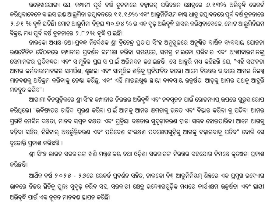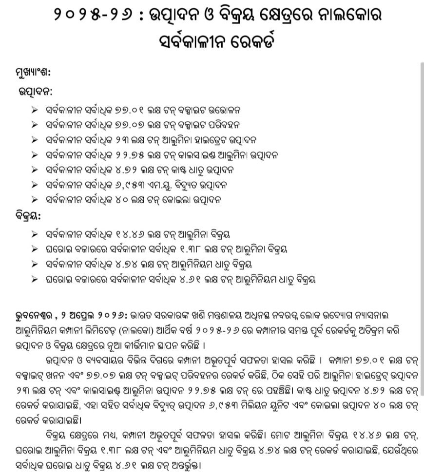 ୨୦୨୫-୨୬ : ଉତ୍ପାଦନ ଓ ବିକ୍ରୟ କ୍ଷେତ୍ରରେ ନାଲକୋର ସର୍ବକାଳୀନ ରେକର୍ଡ
