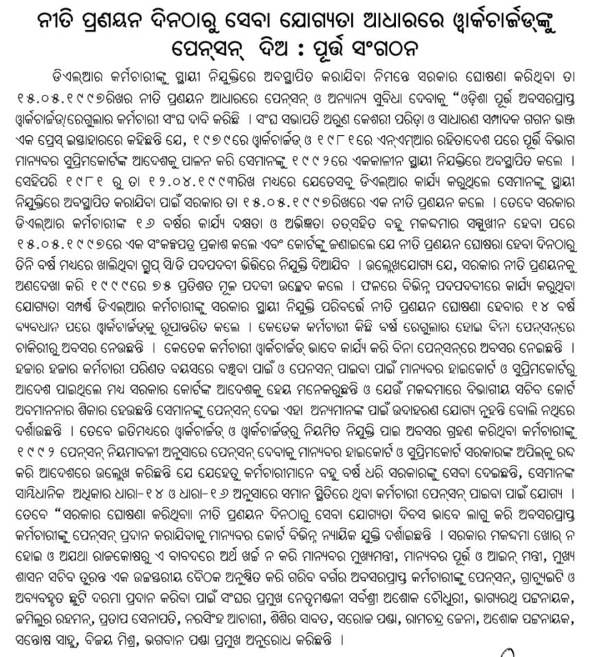 ୱାର୍କଚାର୍ଜଡ଼ କର୍ମଚାରୀଙ୍କୁ ପେନସନ ଦେବା ଦାବିରେ ପୂର୍ତ୍ତ ସଂଗଠନ...