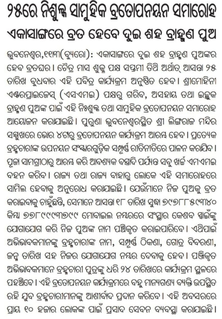 SME ତରଫରୁ ନିଃଶୁକ୍ଳ ସାମୁହିକ ବ୍ରତୋପୟନ...